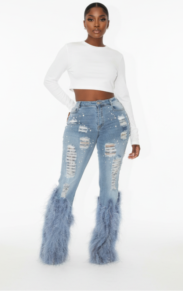 High-waisted feather flare jeans designed to command attention.